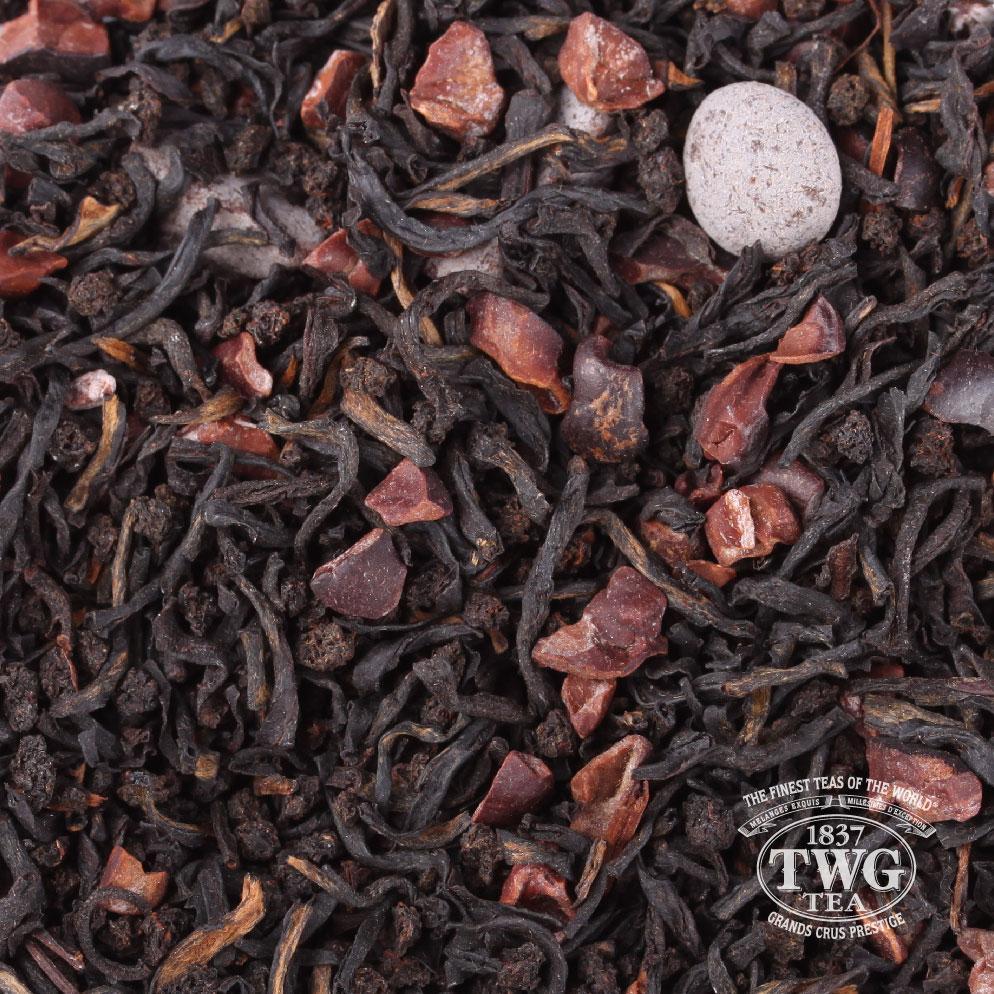 A rich TWG Tea black tea blended with real morsels of dark chocolate and cocoa beans, yielding a truly enveloping and lingering aftertaste. A perfect dessert tea.