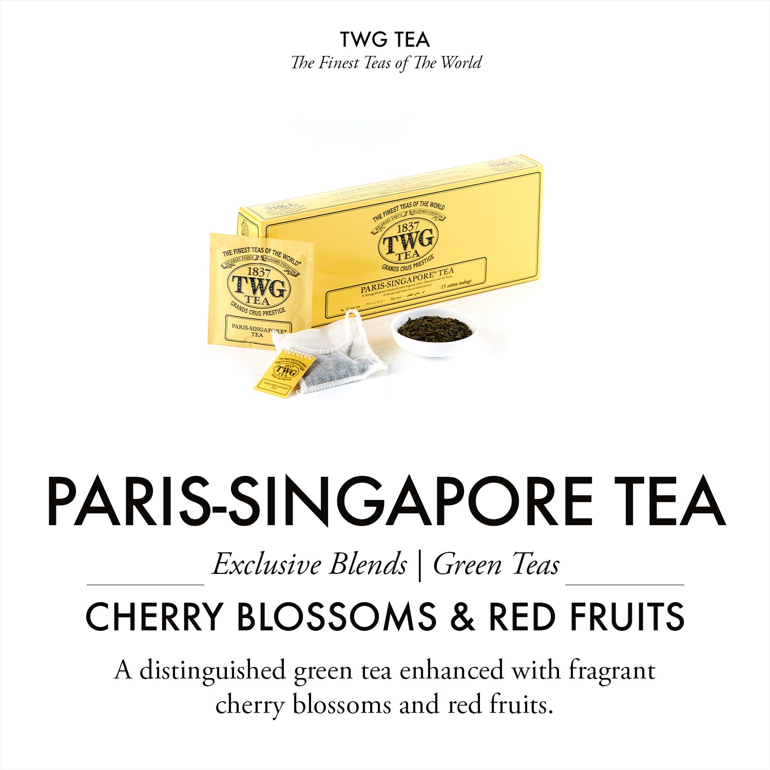 A distinguished TWG Tea green tea enhanced with fragrant cherry blossoms and red fruits. A sensual and sweet tea of reminiscence.