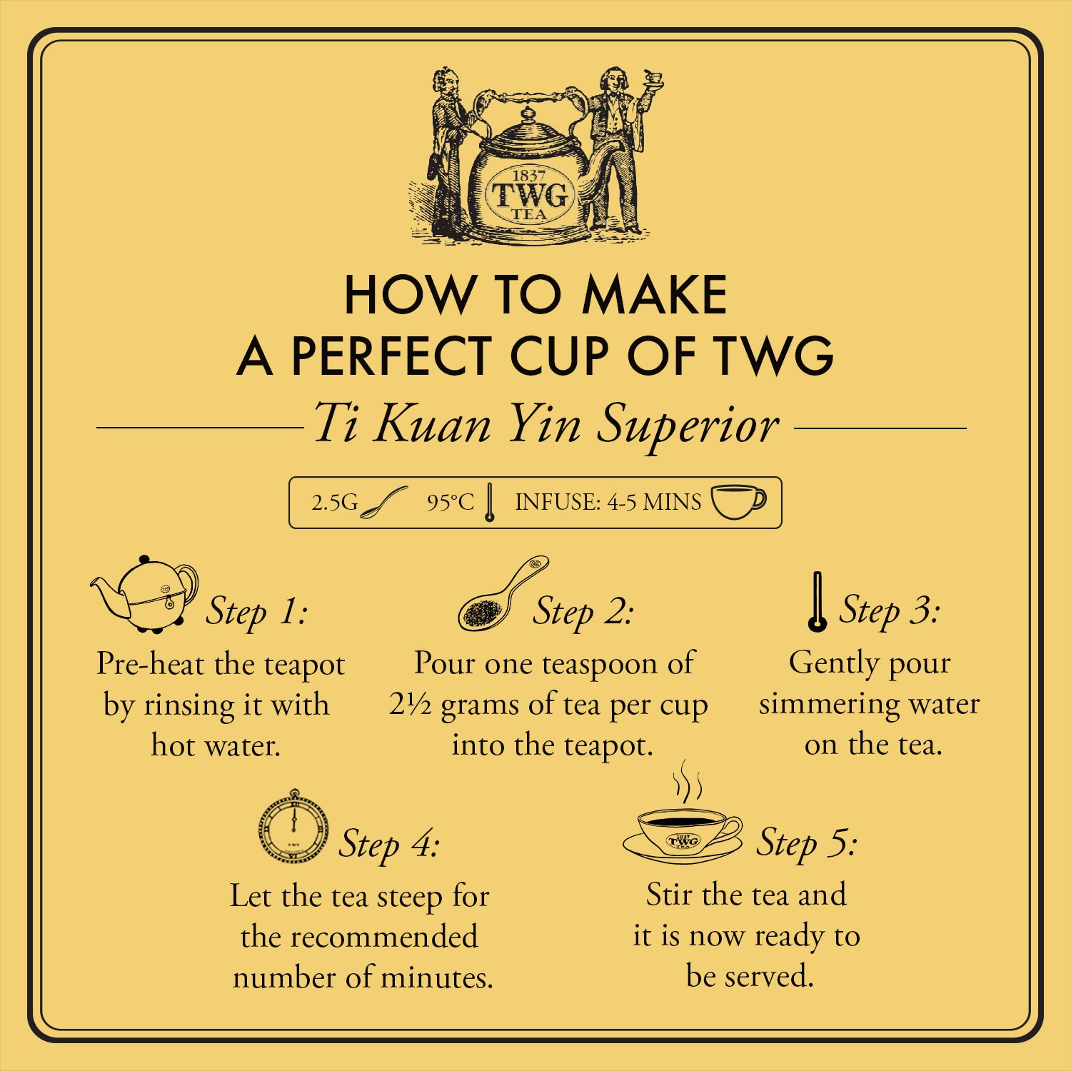 Tea Preparation - Pour 95°C water over one teabag and infuse for 4-5 minutes for one cup, or 5-7 minutes for a small teapot. Remove teabag and serve.
