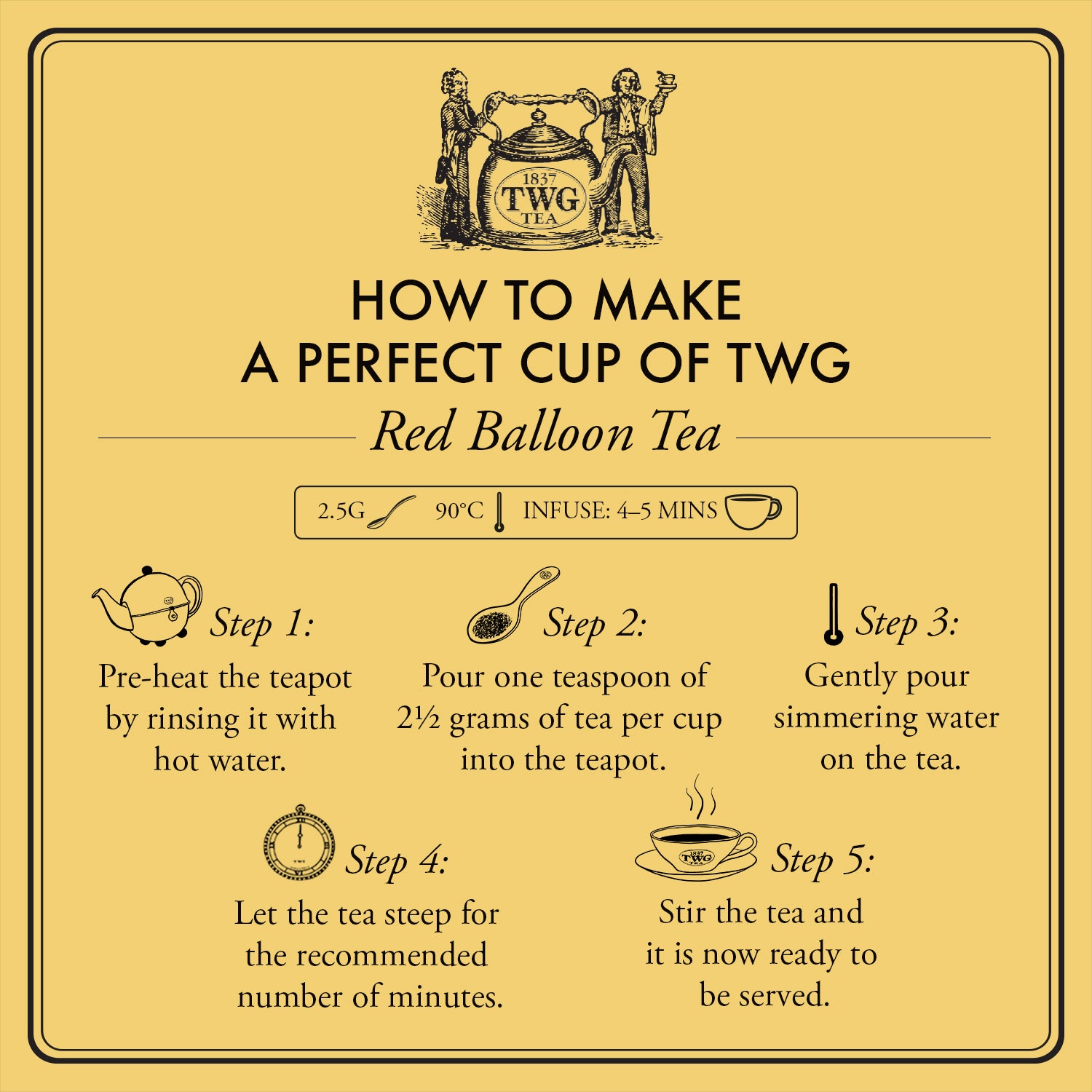 Tea Preparation: Pour 95°C water over 2.5g of tea leaves per cup and infuse for 3 to 4 minutes. Remove leaves and serve.