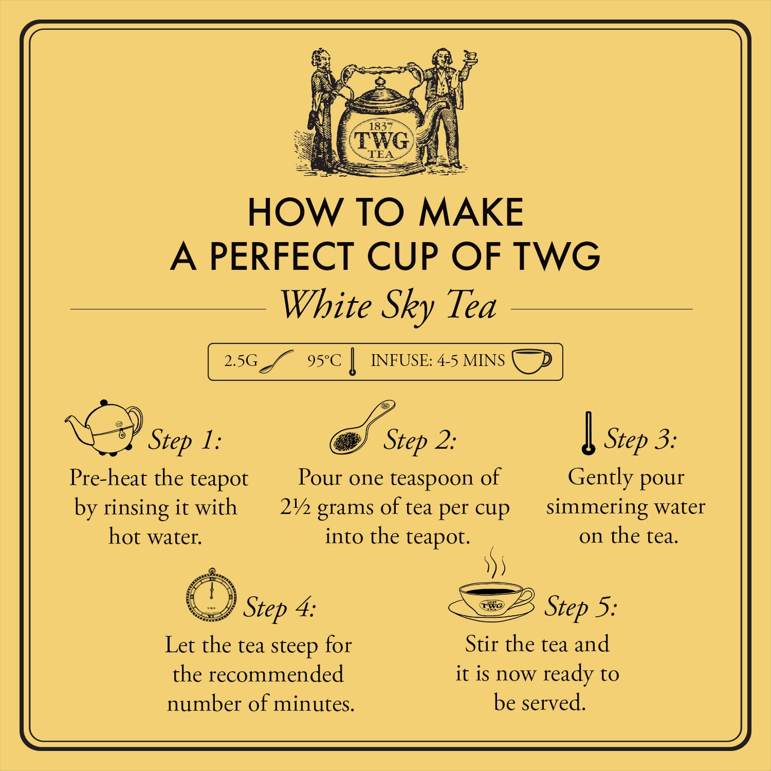 Tea Preparation - Pour 95°C water over one teabag and infuse for 4-5 minutes for one cup, or 5-7 minutes for a small teapot. Remove teabag and serve.